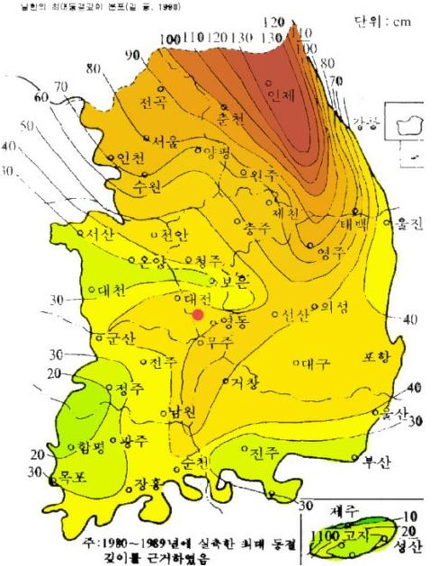 - 동결선(Frost Line) : 땅의 어는 지점을 측정하여 연결한 선