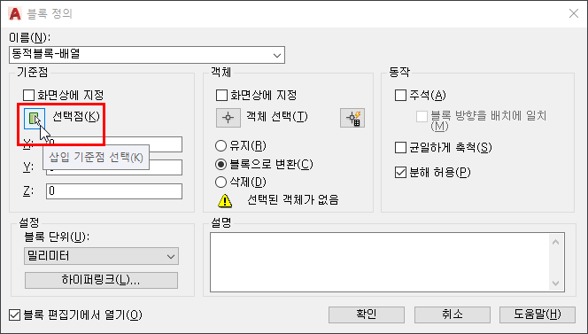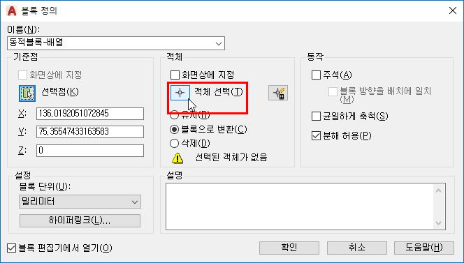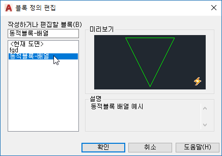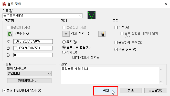 블록(객체)를 더블 클릭하여 블록 정의 편집을 열고 확인을 클릭합니다.