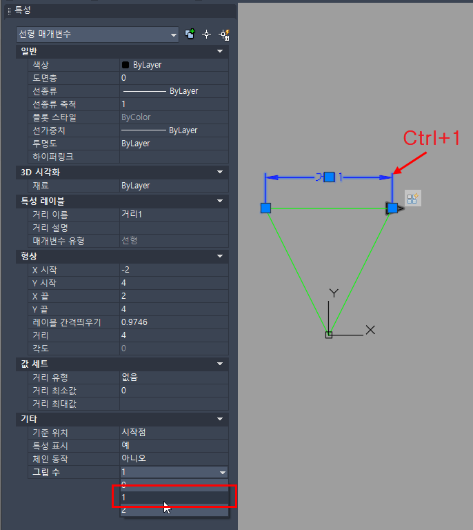 매개변수 "거리1"을 클릭하고 Ctrl + 1을 누릅니다.