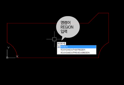5. 폴리선으로 그려진 도형을 영역으로 설정하겠습니다. 명령어 REGION을 입력하고 도형객체를 선택해줍니다.