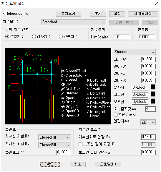 기본값은 xicad/xiLib/xiReferenceFile_Dimension.dwg 에 저장된 치수모양을 가져오는 버튼입니다.