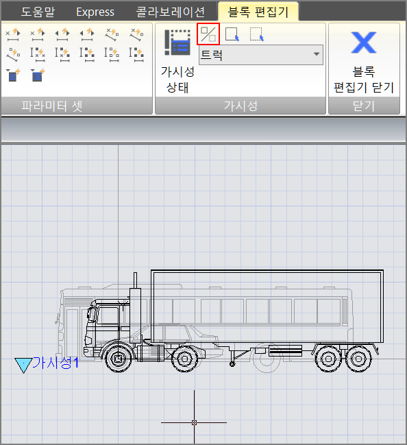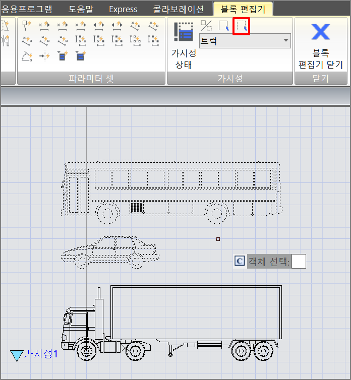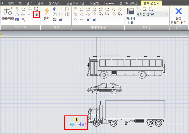 6. 가시성 상태 편집을 완료하고 가시성모드 버튼을 클릭하여 숨겨진 그림을 보이게 설정한 다음, 아래 그림과 같이 세 자동차가 기준점에 서로 겹치도록 이동시킵니다. 저장 후 블록 편집기를 종료합니다.