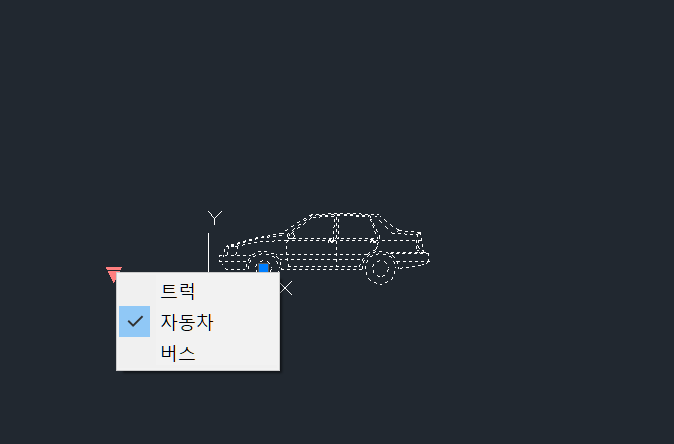 7. 마지막 테스트를 위해 도면에 동적 블록을 삽입하고 동적 블록을 선택한 다음 가시성 매개변수의 그립을 클릭하여 풀 다운 메뉴에서 항목을 하나 선택합니다. 선택한 항목에 따라 그림이 자동으로 변경되면 완료입니다.