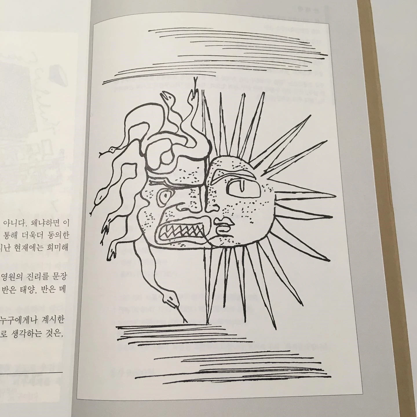 Le Corbusier의 <인간의 집> 마지막 장에 제목도 설명도 없이 실려있는 스케치. 반쪽은 뱀 머리를 가진 메두사 다른 반쪽은 태양의 신 아폴론이라고 사람들이 말해요. 그렇게 보이기도 하구요.