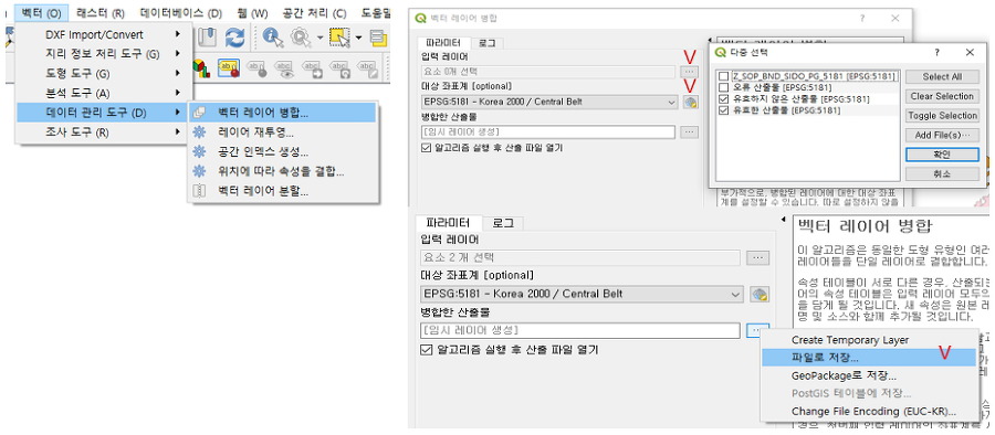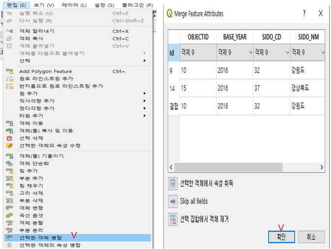선택한 폴리곤들을 병합하는 방법은 다음과 같습니다.