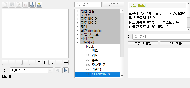 ⭐여기서 포인트는 함수들 목록에서 쭈우욱 맨 아래로 내려서 '필드와 값'을 확인하실 수가 있는데⭐