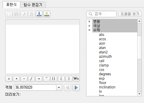 7. 원하는 연산식을 왼쪽 빈 곳에 적으면 되며, 옆 쪽에서 활용이 가능한 함수들을 찾을 수도 있습니다.