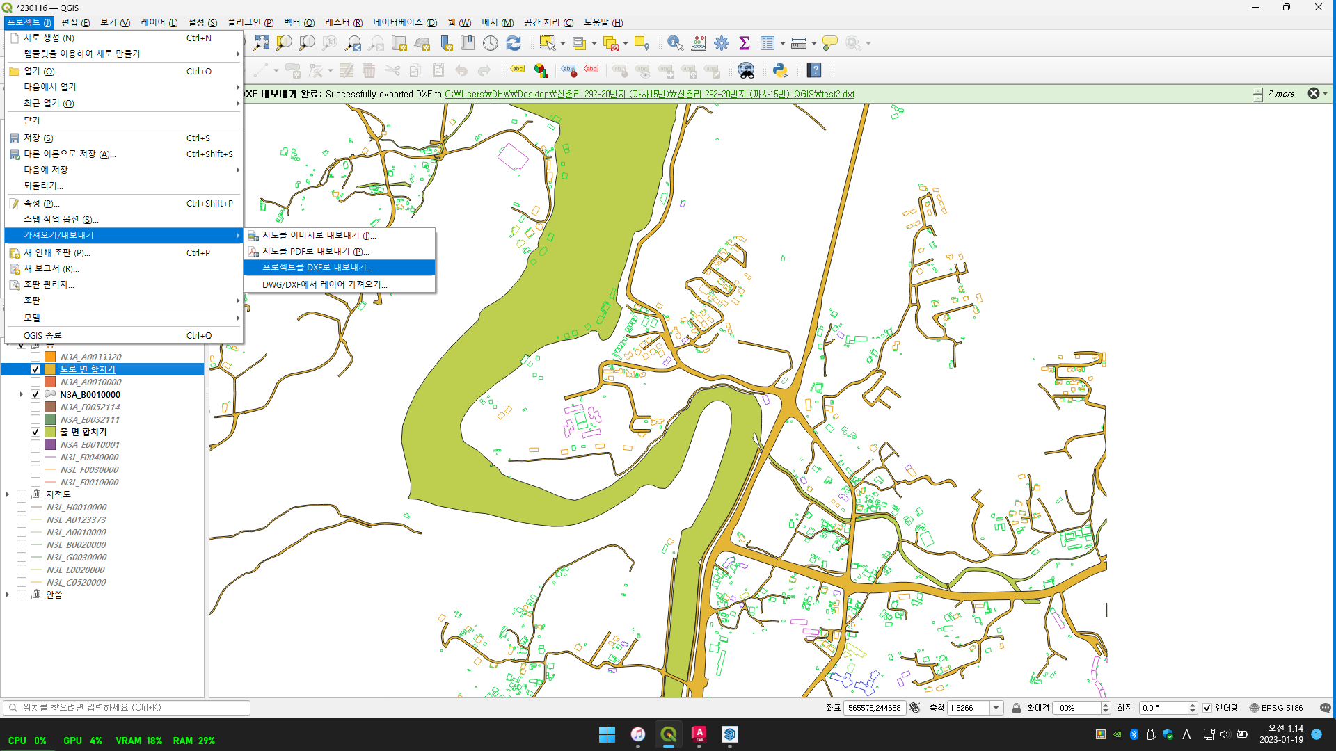 프로젝트 > 가져오기/내보내기 > 프로젝트 dxf로 내보내기
