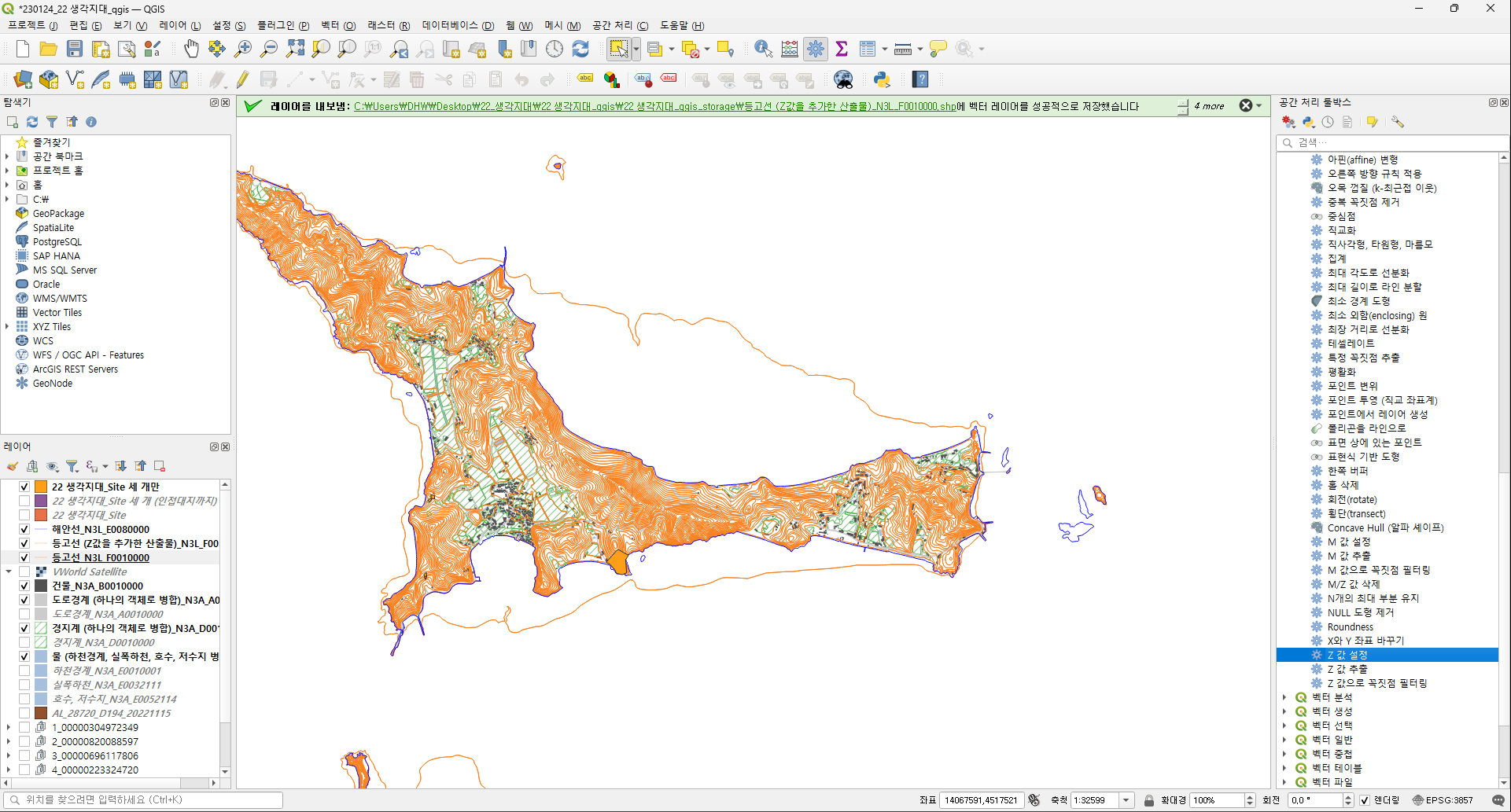 등고선은 그대로 내보내면 등고선에 z값이 입력되어 있지 않음. ansen 유튜브 댓글에 qgis상에서 z값을 입력한 방법이 나와있으니 참고