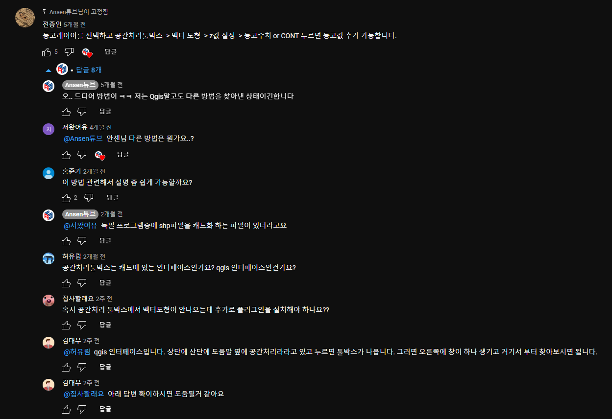 * ANSEN은 등고선은 산출레이어 속성을 count or 등고수 한 후 캐드에 가서 레이어 별로 분류된 등고값으로 Z값을 일일이 작업한다고 함. 유튜브 영상 댓글을 보면 현재는 독일 프로그램을 사용하는 방법을 사용한다고 하는데 ANSEN이 고정시켜놓은 댓글이 간편하고 좋은 방법인 것 같음.