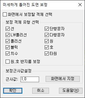 명령어를 실행하여, 설정(S)를 누르면 설정 화면이 나타나면, 여기서 보정하고 싶은 객체의 종류를 선택하고, 보정근사값을 설정하면 됩니다.